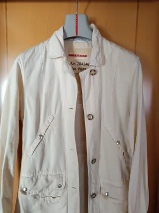 Americana de la prestigiosa marca Prada, perteneciente a su línea roja. Un diseño elegante y versátil. - Color beige. - Cierre de botones. - Bolsillos frontales con solapa y botón. - Cuello camisero.