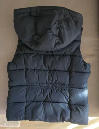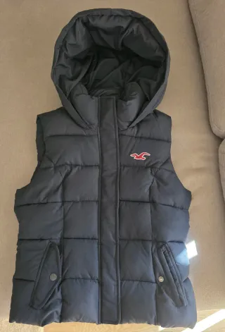 Chaleco acolchado de la marca Hollister, perfecto para añadir una capa extra de abrigo. - Diseño con capucha. - Cierre central con cremallera. - Bolsillos laterales con botón. - Logo de la marca en el pecho.