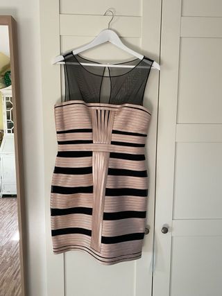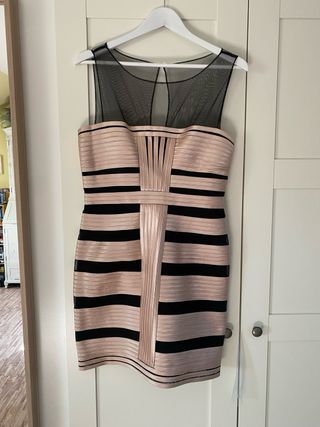 Vestido satinado en colores champagne y negro para fiesta de la marca BCBG Maxazria. Sienta fenomenal. La parte del pecho a los hombros es de tul negro. Talla 42 europea (10 americana).