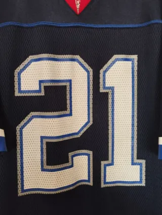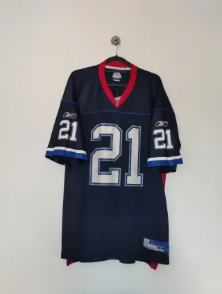 Camiseta de fútbol americano de la NFL, marca Reebok. Diseño deportivo con el número 21. - Color principal azul marino. - Detalles en rojo y blanco. - Talla XL (46/56). - Tiene una tara que se ve en la foto.