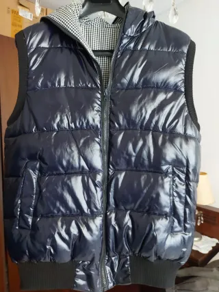 Chaleco metalizado con un diseño moderno y llamativo. - Capucha integrada. - Cierre de cremallera frontal. - Bolsillos laterales. - Forro interior a cuadros.