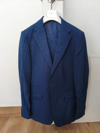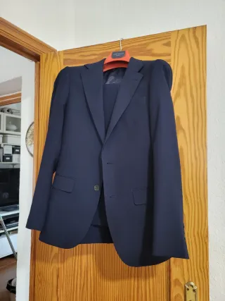 Traje de chaqueta de la marca Alvaro Moreno, en color azul y talla M. Se encuentra en perfecto estado, como nuevo. - Chaqueta con cierre de un botón. - Bolsillos frontales con solapa. - Pantalón a juego. Comprado el año pasado , puesto dos veces hijo 13 años.