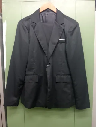 Conjunto de traje de chaqueta y pantalón de la marca Manfinity. Comprado en Shein. Una sola puesta, como nuevo. De color negro. - Chaqueta de un botón. - Bolsillos frontales en la chaqueta. - Bolsillo de pecho con pañuelo blanco. - Pantalón de cintura elástica. Envío por Wallapop. También entrego en mano en Sevilla y Málaga.