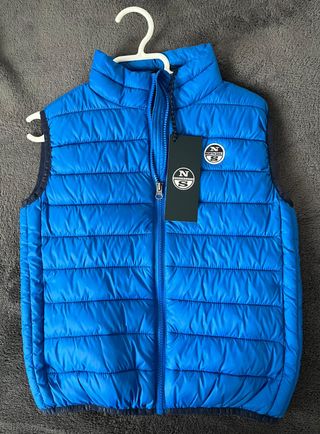 Chaleco acolchado de la marca North Sails para niño en color azul. Talla 12 años. Artículo nuevo a estrenar con etiquetas. Ideal para entretiempo. P.V.P.: 42 €. Entrega en mano en la ciudad de Sevilla. - Diseño sin mangas. - Cierre de cremallera frontal. - Detalle de logo en el pecho.