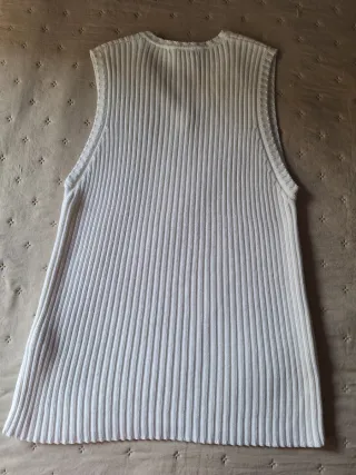 Chaleco de punto blanco con cuello en V. Ideal para añadir una capa extra a tu atuendo. Sin usar. Largo 63-64 cm. - Tejido de canalé. - Diseño sin mangas. - Cuello en pico.