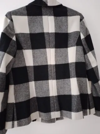 Americana de mujer con un llamativo estampado de cuadros. - Diseño de cuadros grandes en blanco y negro. - Cuello solapa clásico. - Dos bolsillos frontales. - Cierre de botones.