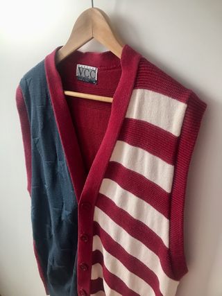 Chaleco de punto con un diseño inspirado en la bandera americana. Vintage, made in USA. Marca: Vantage Club Collection VCC Color: Azul, rojo burdeos, blanco Talla: M (hombre) Comprobar medidas para asegurar el ajuste perfecto! Medidas: (ver fotos) - Hombros: 45 cm - Sisa a sisa: 52 cm - Bajo: 44 cm - Largo: 73 cm Material: 100% algodón Detalles: - Escote en pico y cierre con botones - Panel izquierdo azul con estampado de estrellas. - Panel derecho a rayas rojas y blancas. Estado: Un pequeño defecto visible en la última foto. Muy buen estado general. Descubre más prendas únicas en mi perfil. Haz pack y ahorra en el envío.