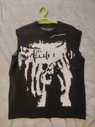 Prenda de punto sin mangas (chaleco) o con mangas largas, de corte oversize (extragrande) y unisex, hecha comúnmente de materiales como acrílico o una mezcla de algodón. Presenta un patrón de jacquard.