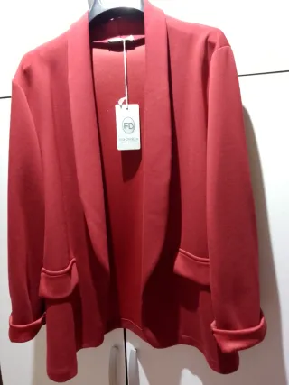 Americana de punto en color rojo, completamente nueva. - Diseño abierto. - Bolsillos frontales. - Puños vueltos.