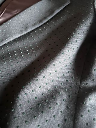 Traje de la firma Italiana Fdn para caballero . Americana micro rayas con puños en pico haciendo juego con las solapas . Pantalón con fajin incorporado . Un montón de detalles propio de la alta costura Italiana .Usado solo en una noche vieja- Perfecto para estas fiestas , bodas , eventos - Solapas de pico en negro. - Forro interior con estampado de puntos blancos. - Dos botones frontales. - Puños de manga con detalle de botones negros. - Bolsillos frontales con solapa.