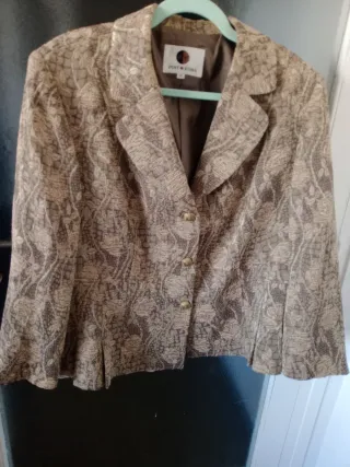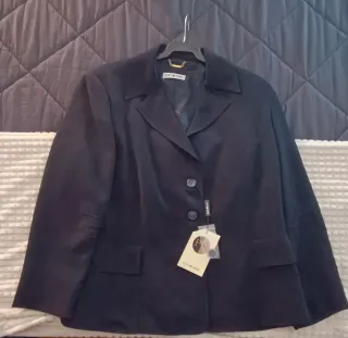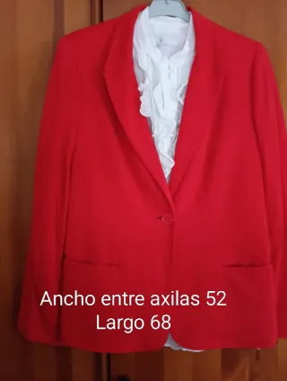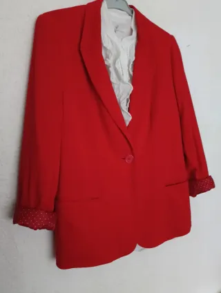 Es una americana ligera de punto muy suave y agradable de tacto, buena caida, tiene bolsillos reales. Lleva forro completo rojo con pequeños topitos blancos. La llevé para una comunión, está totalmente nueva, sienta muy bien. Es ideal tanto para eventos como para el diaya dia. Muy cómoda de llevar. Regalo la blusa que es de algodón muy fino, tipo batista con chorreras, es preciosa, es un poco más ancha qué la chaqueta, clarea algo tal como se ve en las fotos . La he usado bastante pero aún está en buen estado, sólo le falta algún botón