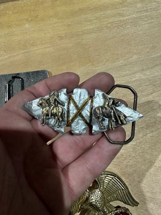 Hebilla de cinturón con diseño de punta de flecha y figuras ecuestres. - Detalle de nativos americanos montando a caballo. - Elementos decorativos en dorado y plateado.