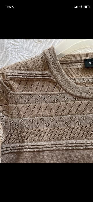 Camiseta de punto con un diseño calado y detalles en relieve. Hilo metalizado dorado en delantero y mangas. Muy cómoda queda muy bonita con una americana. Hombros 36 Sisa a sisa 43 Largo 57 - Tejido suave y ligero. - Patrón de rombos y líneas. - Cuello redondo. - manga al codo