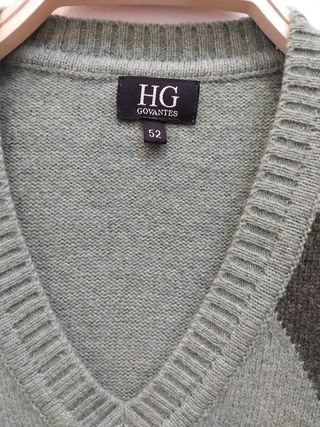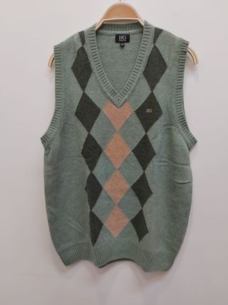 Chaleco de punto estilo Argyle marca HG, Hermes Govantes (diseñador sevillano), para caballero / chico / hombre, diseño de rombos en tono verde claro, verde oscuro, rosa palo y gris/azul claro, 80 % lana + 20 % nylon, según etiqueta talla 52, en muy buenas condiciones. Se puede enviar o recoger en Tienda Solidaria Piel de Mariposa SEVILLA C/Feria 145 (+ info en la última foto)