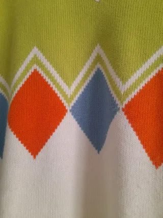 Chaleco de punto con diseño de rombos. - Cuello en pico. - Tejido de punto. - Diseño de rombos en la parte superior. 70 cm de sisa a sisa y 80 cm largo