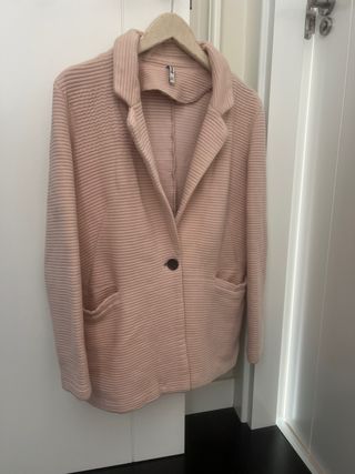 Americana de punto en tono rosa claro. Presenta un diseño moderno y cómodo. - Cuello solapa. - Cierre de un botón. - Bolsillos delanteros.