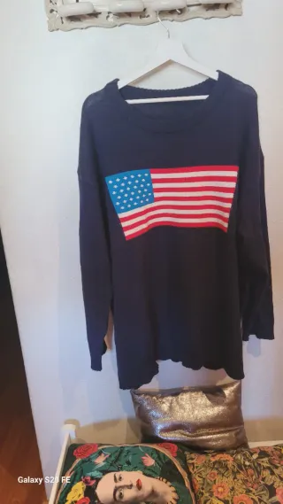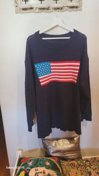 Jersey de punto azul marino con un diseño de bandera americana en el pecho. - Talla 4XL. - Diseño de bandera americana en contraste. Medidas hombro 66cm,pecho154cm,largo 77cm,