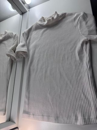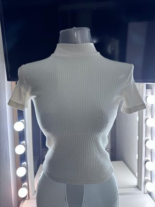 ¡Un básico imprescindible para cualquier fondo de armario! Este top combina sencillez y elegancia con un toque retro gracias a su cuello subido. ✨ Detalles del producto: Marca: Pull&Bear. Talla: S (EUR S / USA S / MEX 26). Color: Blanco roto / Crema (fácil de combinar). Tejido: Punto de canalé elástico que se adapta perfectamente al cuerpo. Corte: Manga corta y cuello alto/perkins (mock neck). Estado: En perfecto estado, muy poco uso. 💡 Ideas de estilo: Ideal para llevar con jeans de tiro alto para un look casual, o bajo una americana para un outfit de oficina más sofisticado.