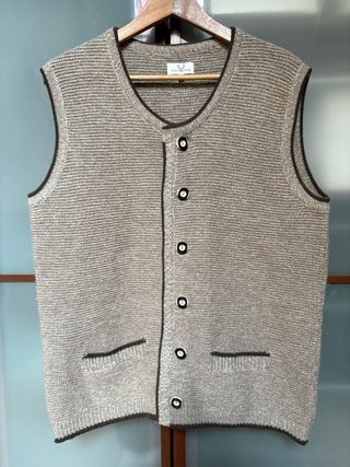 Chaleco de punto de estilo vintage con un diseño clásico. - Cuello redondo con ribete. - Cierre de botones. - Dos bolsillos delanteros. - Ribete en contraste en mangas y bajo.
