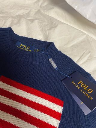 Jersey de punto azul marino de Polo Ralph Lauren con diseño de la bandera de Estados Unidos. - Detalle de la bandera americana en el pecho. - Cuello redondo y manga larga. - Acabado en punto. - Logo RL bordado en la parte inferior.