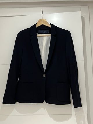Anericana de punto de Zara, talla L (equivalente a 40 o 12). Es de color azul marino y tiene un tejido ligeramente texturizado. - Diseño clásico de chaqueta blazer. - Cierre con botones (no visibles en la imagen). - Manga larga.