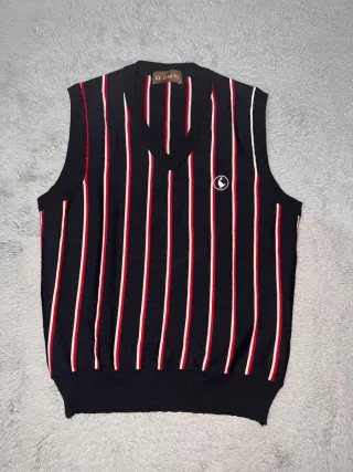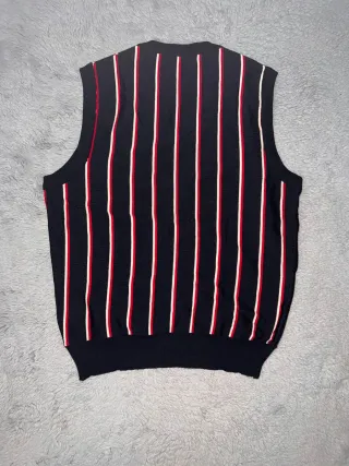 Chaleco de punto El Ganso con un diseño clásico de rayas verticales. - Cuello en pico. - Detalle de logo bordado en el pecho. - Combinación de colores negro, blanco y rojo.