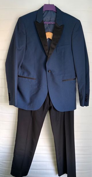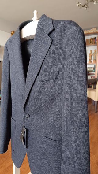 Blazer Slim fit, composición: 75% algodón, 22% poliéster, 3% elastano, azul marino punto de espiga. Nueva de esta temporada, se puede ver en la pagina web de Mango. Regalo corbata de seda.