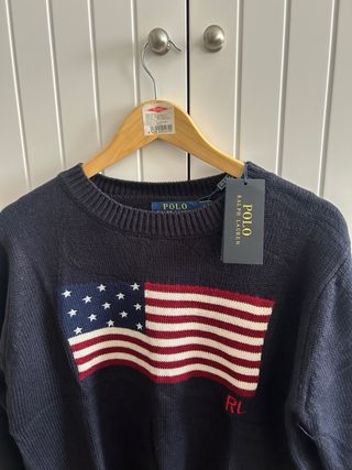 Jersey de punto con diseño de la bandera americana. - Manga larga. - Cuello redondo. - Tejido suav Sin estrenar, comprado invierno 2025.