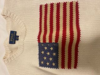 Suéter de punto con diseño de la bandera americana. Vendo jersey bandera ralph lauren talla s,modelo exclusivo del año pasado.Valor en tienda 400 euros .Es una S q equivale a una M.Factura de compra de la tienda Farfetch.Talla agotada sin stock . - Cuello redondo. - Mangas largas. - Detalle de RL bordado.