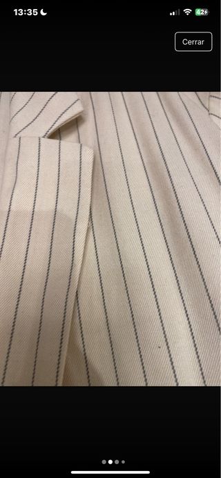 Americana elegante de corte clásico con un diseño de rayas verticales. - Diseño de rayas finas. - Forro interior. - Cierre de botones. Es talla 34 pero talla grande.