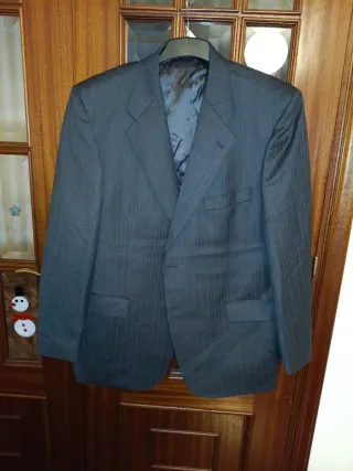 Traje de chaqueta y pantalón con un elegante diseño a rayas. Puesto solo en una ocasión. Talla 52 de chaqueta - Chaqueta de corte clásico. - Pantalón a juego. - Diseño a rayas verticales.