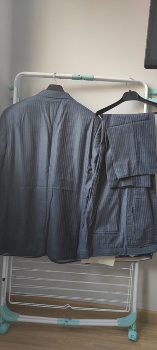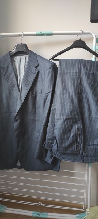 Vendo traje gris con rayas, talla chaqueta 58 talla pantalón 106, la chaqueta en buen estado el pantalón un poco de desgaste ver en la foto, está arrugado por tener en el armario.