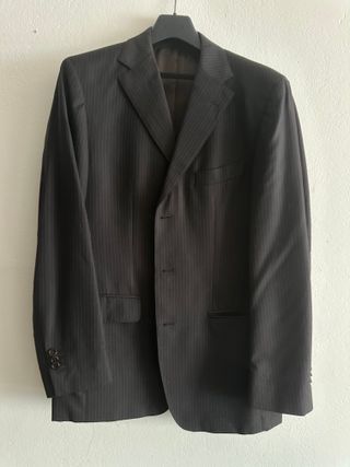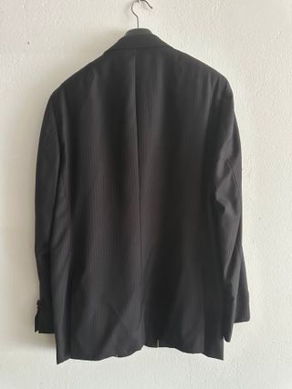 Traje de hombre negro con finas rayas. En buen estado. Únicamente le falta un botón negro a la chaqueta.