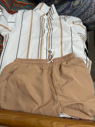Conjunto de ropa casual con camisa de rayas y pantalón corto. - Camisa blanca con rayas verticales marrones y negras. - Pantalón corto de color beige. - Cierre de botones en la camisa. - Cintura elástica con cordón en el pantalón.