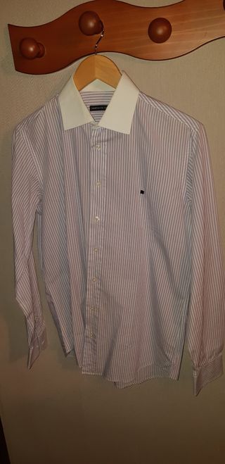Traje (talla 50) y camisa (talla 3) de Purificación García. Se encuentra en perfecto estado, ya que se ha usado en 3 ocasiones. El traje es de color gris y la camisa de rayas blancas y moradas (a juego con el forro de la chaqueta)