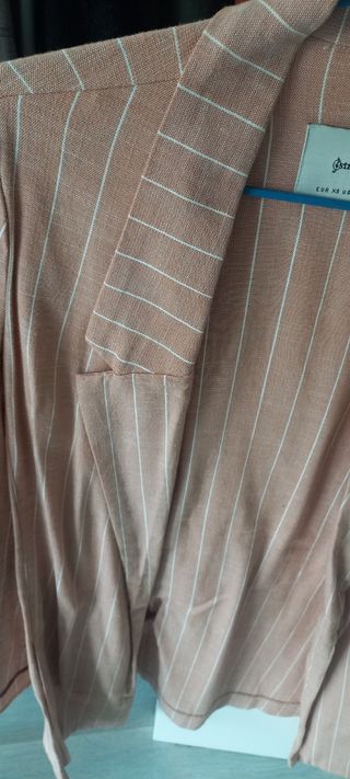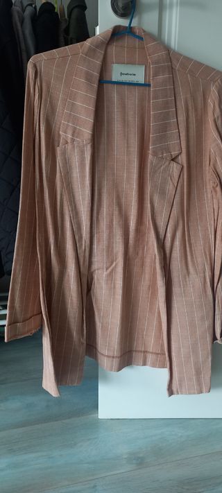 Americana fluida de color rosa y con rayas blancaa.Es fluida y muy comoda de llevar.No tiene botones, es abierta.Tambien tengo el pantalon de vestir a juego.