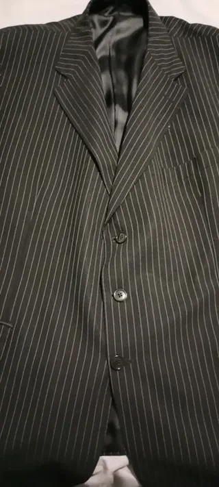 Conjunto de traje de chaqueta y pantalón, la chaqueta de talla 52 y el pantalón es de 44. El diseño presenta un sutil estampado de rayas verticales. - Chaqueta con solapas clásicas. - Cierre de botones en la chaqueta. - Bolsillos frontales en la chaqueta y interiores. La tela del traje es densa.