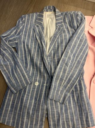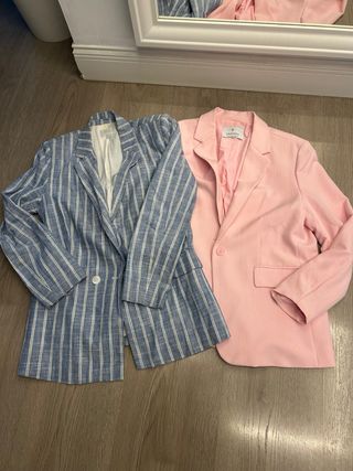 Lote de dos americanas para mujer, una en tono azul con rayas blancas y otra en color rosa. - Americana azul con estampado de rayas verticales. - Americana rosa lisa.