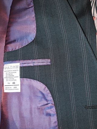 Traje de hombre de raya diplomática que incluye chaqueta y pantalón, los dos de color negro con raya y forro de color morado. Medidas chaqueta. Espalda ancho: 44 cm. largo: 76 cm. El pantalón es una talla 40 mide de largo 98 cm y tiene dobladillo de 4 cm(bordado para persona de 1,65-1,70 m) Tejido: 80% poliéster 15% Rayon 5% Elastán (chaqueta y pantalón) excepto el forro de la chaqueta que está hecho de Viscosa 50% y Poliéster 50%. Se vende también SOLO la americana por 20€.