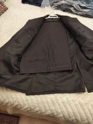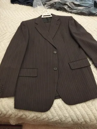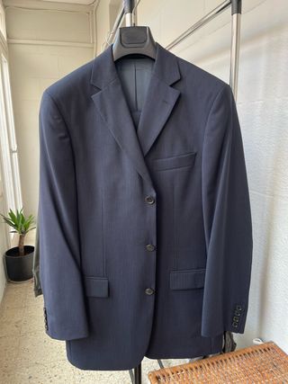 Traje completo de dos piezas con un diseño clásico de rayas verticales. - Chaqueta con solapas. - Cierre de botones en la chaqueta. - Pantalón a juego. Hombre (Pantalones/Chaquetas): 48 IT = 40-42 ES / 44-46 EU (S/M) ESTA NUEVO A ESTRENAR SE COMPRO DE REBAJAS HACE 1 AÑO