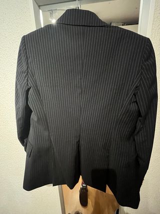Americana elegante de corte clásico con un diseño de rayas verticales. - Diseño de rayas finas. - Forro interior. - Cierre de botones. Es talla 34 pero talla grande.