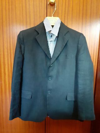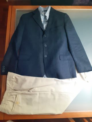 Traje con americana de lino azul marino,camisa de rayas azul /blanca y pantalón beige de la talla 10 excepto camisa talla 8. Dos usos en dos comuniones.Marca BTP