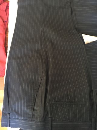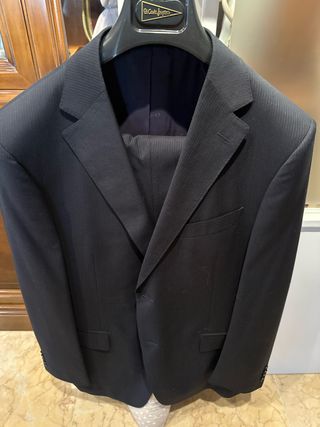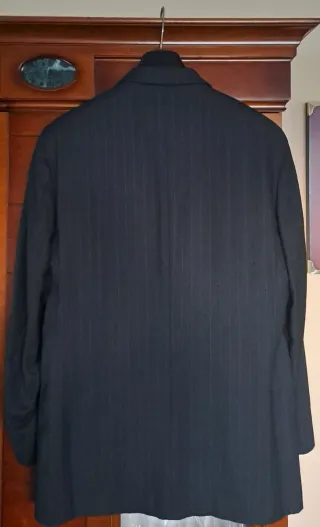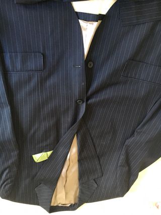 Traje de chaqueta y pantalón azul marino rayas finas negras. Chaqueta de cierre con tres botones. Los bolsillos frontales están cerrados, tiene dos interiores, uno de ellos cerrado con botón. El pantalón se cierra con botón y cremallera. Tiene dos bolsillos laterales y uno trasero cerrado con botón. Talla 56. Está nuevo, muy poco utilizado. Es de la marca easy wear.