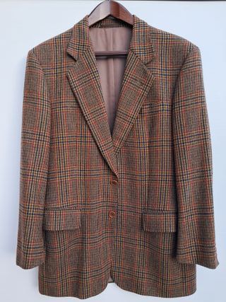 Chaqueta de traje con un diseño a cuadros en tonos marrones y grises. Fondo gris con rayas finas marrones y beiges. - Cuello solapa. - Cierre de botones. - Bolsillos frontales. Nota: sólo envío por wallapop.