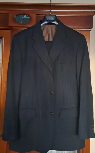 Traje de dos piezas en color gris oscuro, con suave raya diplomática. Talla: 44 - Muy poco uso, utilizado únicamente para boda. - Chaqueta con tres botones (gris oscuro, elegantes y discretos) y bolsillos. - Corte clásico ideal para eventos formales, entrevistas, trabajo, o reuniones. - Incluye chaqueta y pantalón a juego. - Siempre guardado en percha y bien cuidado. El traje es cómodo, elegante y fácil de combinar con camisa blanca o clara. Se vende porque he engordado y ya no le utilizo. Posibilidad de entrega en mano. Cualquier duda preguntame sin compromiso