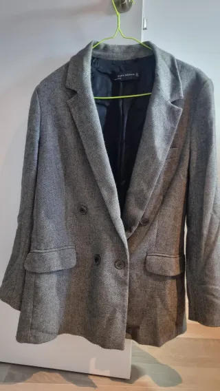 Americana de la marca Zara con un diseño de rayas clásico y elegante. - Diseño de doble botonadura. - Bolsillos frontales. - Cuello solapa. Sin usar