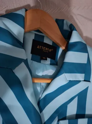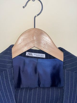 Americana de Zara con un diseño de rayas finas en azul y blanco. Es una prenda elegante y versátil. - Cierre de un botón. - Dos bolsillos delanteros. - Puños con botones.