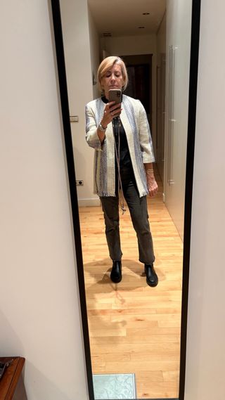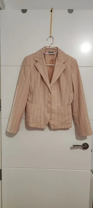 Chaqueta con un diseño de rayas finas en tonos marrones y beige. Presenta un corte clásico con solapas y cierre de dos botones. - Diseño de rayas finas. - Cierre de dos botones. - Bolsillos frontales. - Puños con detalle de botones. No entregamos en mano. Solo enviamos a través de esta plataforma. Si estás interesado en más artículos, dímelo para enviártelo junto y así ahorrar en el envío. Por favor, comprueba las medidas antes de comprar. Medidas: Hombro a hombro: 47 cm Axila a axila: 58 cm Largo: 77 cm Composición: Tejido de punto de algodón, lino y elastán.