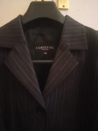 Traje de dos piezas de la marca Cortefiel, con un elegante diseño de rayas verticales. - Chaqueta con solapa de muesca. - Cierre de botones en la chaqueta. - Pantalón a juego con el mismo estampado.