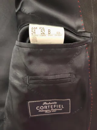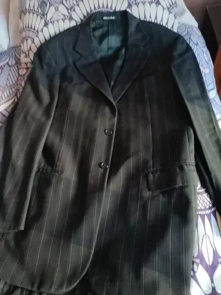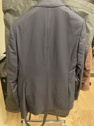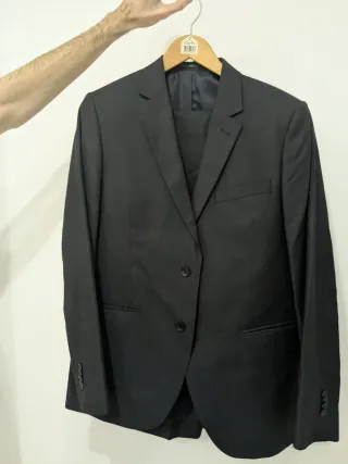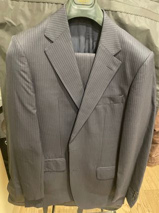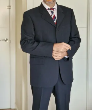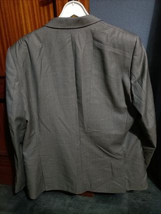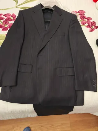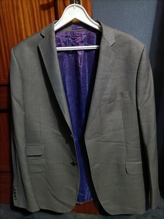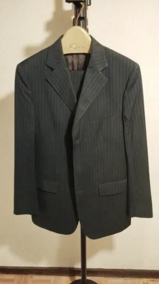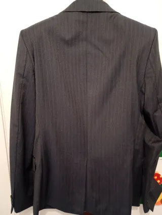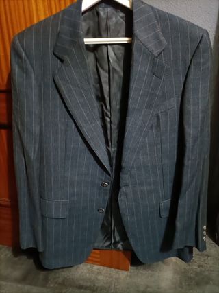Traje de dos piezas con un diseño de raya diplomática. El color real es el de las 2 primeras fotos, las siguientes son para enseñar la raya diplomática. Talla 54 que corresponde como a una M-L. - Chaqueta con solapa de muesca. - Cierre de dos botones en la chaqueta. - Puños con botones. - Bolsillos con solapa en la chaqueta.